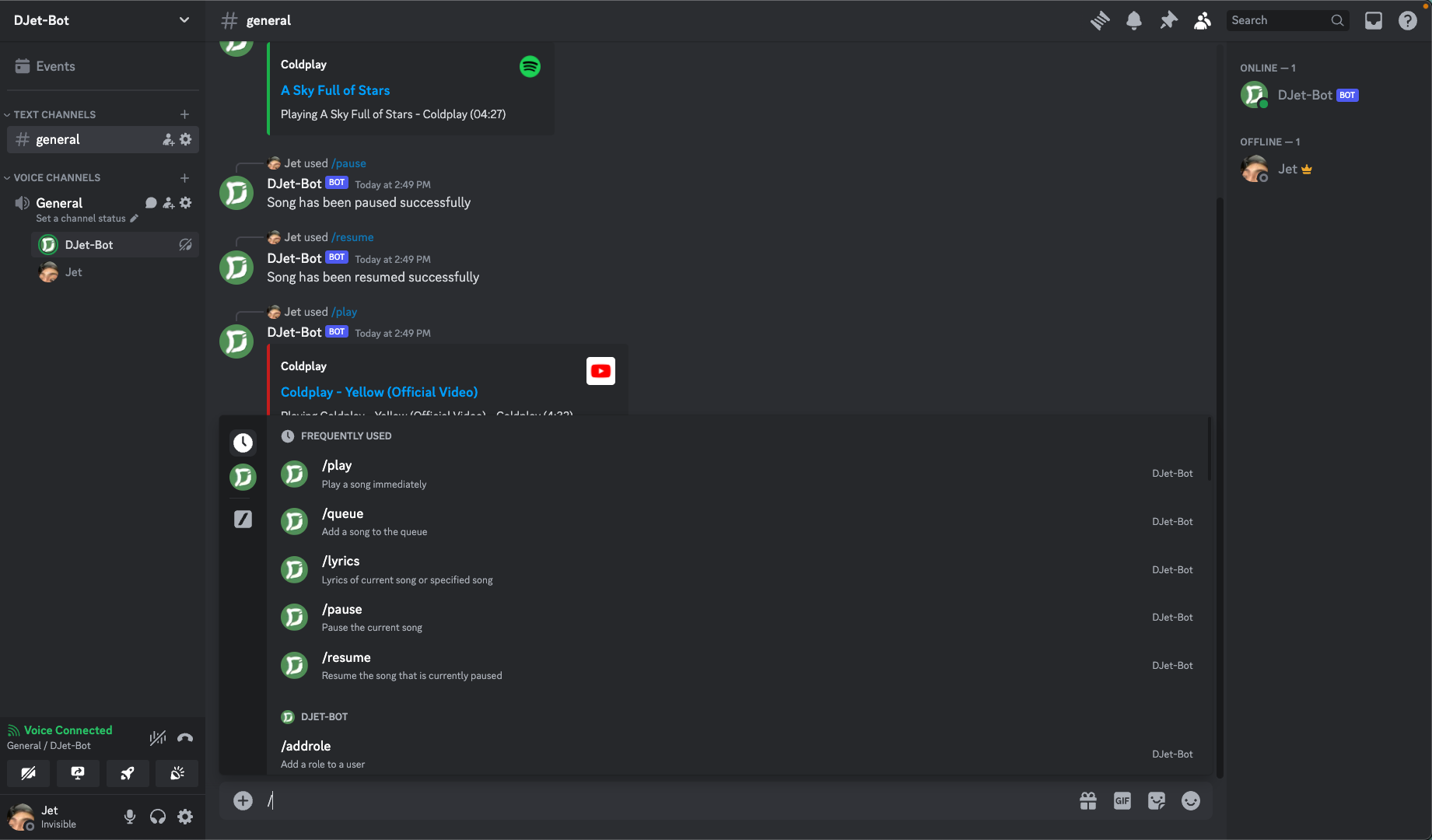 DJet Bot is a discord music bot that allows users to play music in voice channels of servers. It is built by using the discord.js and discord-player libraries.