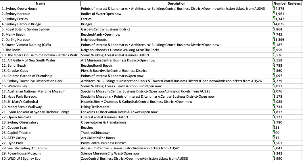 1. Web-scraper that pulls data from TripAdvisor to get the top attractions in Sydney and put the data into an excel file. Built using the playwriter library.